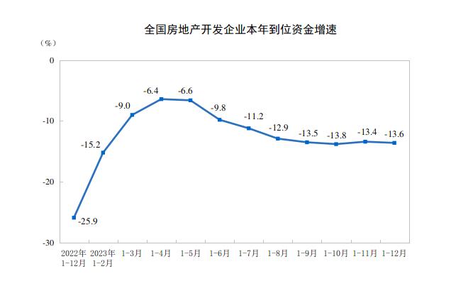 2023年,房地產(chǎn)開發(fā)企業(yè)到位資金127459億元,比上年下降13.6%。其中,國內(nèi)貸款15595億元,下降9.9%;利用外資47億元,下降39.1%;自籌資金41989億元,下降19.1%;定金及預(yù)收款43202億元,下降11.9%;個(gè)人按揭貸款21489億元,下降9.1%。
