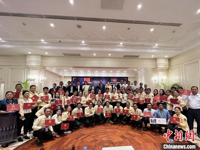 8月21日至30日,柬埔寨中文導(dǎo)游海外培訓(xùn)班在暹粒舉行,來自金邊和暹粒兩地的60名中文導(dǎo)游及旅游從業(yè)者參加培訓(xùn)學(xué)習(xí)。圖為8月30日,柬埔寨中文導(dǎo)游海外培訓(xùn)班結(jié)業(yè)典禮。 中新社發(fā) 項目團(tuán)隊供圖