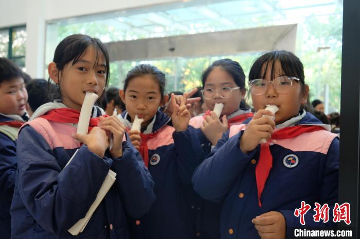 近日,楊允慈(左一)和同學們一起品嘗剛出爐的寧波年糕。中新社記者 林波 攝