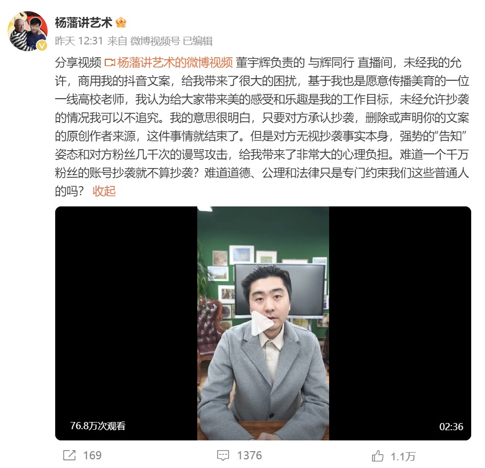 近日,擁有百萬粉絲的人文藝術(shù)博主楊藩發(fā)布視頻稱,“與輝同行”主播董董抄襲自己的視頻文案,再度將董宇輝直播團(tuán)隊推上熱搜。