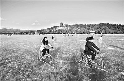 頤和園冰場的景色絕佳,冰場四周環(huán)繞著頤和園的亭臺樓閣,游客在冰面滑行的過程中,可切身感受到古人造園“步移景異”的精妙之處。冰上賞景的最佳選擇是騎行冰上自行車,冰上自行車幾乎對技術(shù)零要求,因?yàn)橛薪饘倏蚣艿闹危T行時比普通自行車還要平穩(wěn),冰上自行車可快可慢、可??烧荆慰秃粑遒目諝?,眼前則是高大雄偉的佛香閣與遼闊的西山群峰,盡管腳下在奮力地蹬車,在不知不覺間已融入到頤和園的山水畫卷之中。