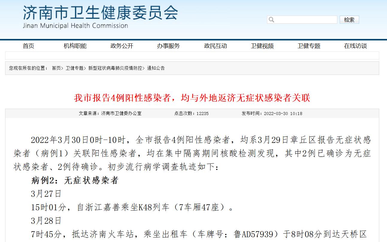 濟南市報告4例陽性感染者,均與外地返濟無癥狀感染者關聯