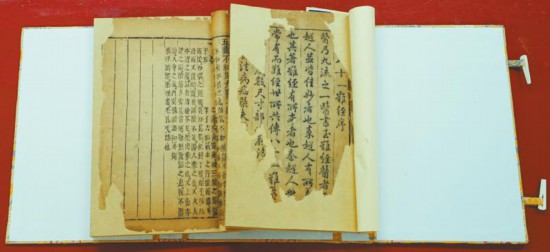 明刻本《陳伯玉文集十卷》收錄了唐代詩人陳子昂的作品,對于研究其文風具有極高意義。這本館藏文物為李一氓先生捐贈。修復(fù)時,袁東玨將書拆開,反面朝上,用毛筆蘸上糨糊,把相同材質(zhì)、色澤相近的補紙粘到破損部位,只保留2毫米的重疊部分,再把多余的補紙撕下。修復(fù)之前,書籍第一冊李一氓題寫的書簽,已布滿污垢,經(jīng)袁東玨巧手將書簽揭下修補洗凈后,書簽上原有的金粉露出了本色,微光閃閃。再后,袁東玨利用國畫顏料曙紅、鈦白、赭紅、墨色調(diào)配成藕荷色,染色宣紙補書皮,內(nèi)頁用毛太紙,溜口用皮紙染成相近顏色修補。為達到修舊如舊的效果,盡管該書還有版心斷裂等問題,但考慮到這些是鑒定版本的重要依據(jù),袁東玨并未過多干涉,保留了原樣。