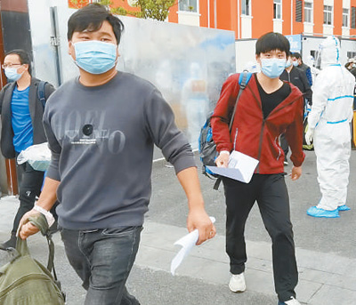 一個小時后,大巴停在閔行區(qū)浦江鎮(zhèn)談連方艙醫(yī)院門口。200多名康復者背著大包小包,已經在院子里排隊,經工作人員指引依次登記出艙。