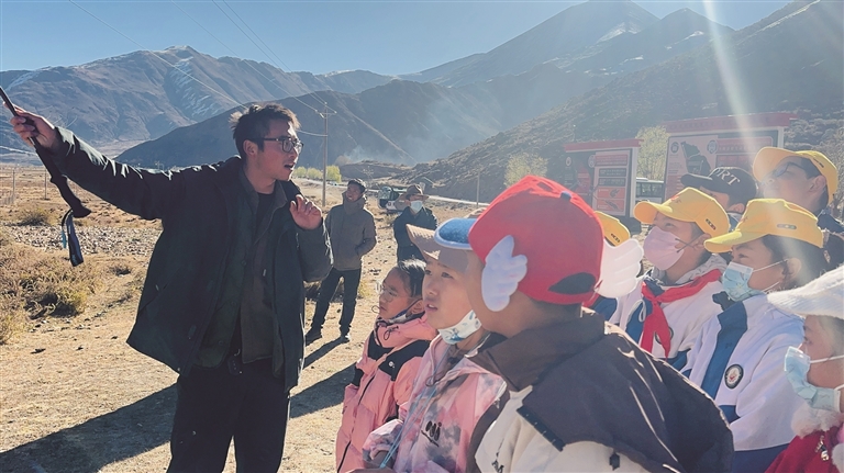 小朋友們在保護中心工作人員李義旺的帶領(lǐng)下了解雪豹生存環(huán)境。