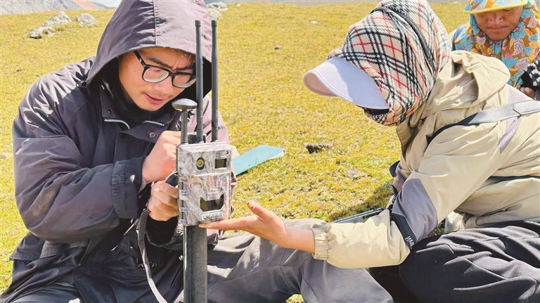 保護中心工作人員李義旺教當?shù)剞r(nóng)牧民架設(shè)紅外相機。