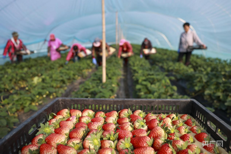 央廣網(wǎng)泰州12月13日消息(記者王姝姝)12月11日,江蘇省泰州市姜堰區(qū)蔣垛鎮(zhèn)鹽大村草莓種植基地,農(nóng)民們在大棚內(nèi)采摘草莓。