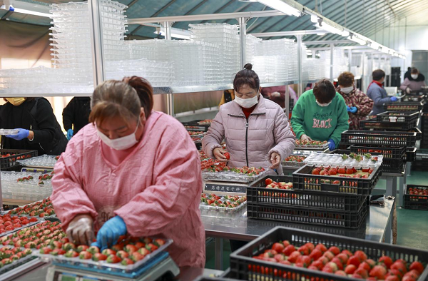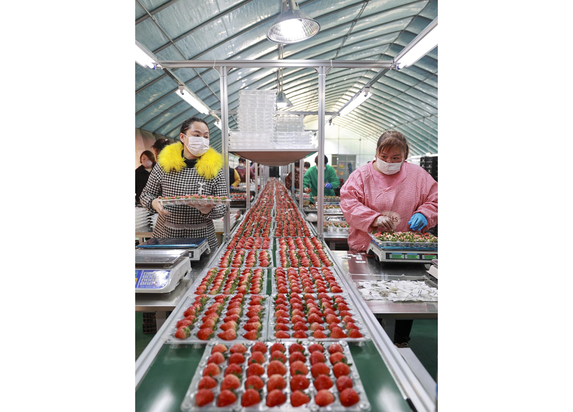 工人們在流水線上分揀草莓(央廣網(wǎng)發(fā) 顧繼紅 攝)