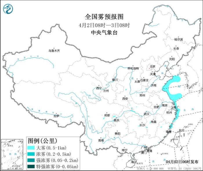 預計,4月2日白天,黃海中西部海域、山東半島東部和南部沿岸海域、浙江沿岸海域將有能見度不足1公里的大霧。此外,4月2日傍晚至3日早晨,黃海西南部海域、江蘇中部和南部沿岸海域、長江口附近海域、杭州灣附近海域、浙江中北部沿岸海域將有能見度不足1公里的大霧。中央氣象臺4月2日06時繼續(xù)發(fā)布大霧黃色預警。