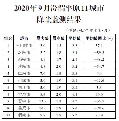 9月,汾渭平原11個(gè)城市降塵量均值范圍在2.2-5.7噸/平方千米·月之間,平均為3.8噸/平方千米·月,同比下降22.4%。汾渭平原11個(gè)城市降塵量平均值均小于9.0噸/平方千米·月。渭南、呂梁、晉中等3個(gè)城市降塵量最大值高于9.0噸/平方千米·月。三門(mén)峽、銅川、寶雞、渭南等4個(gè)城市降塵量平均值同比不降反升。