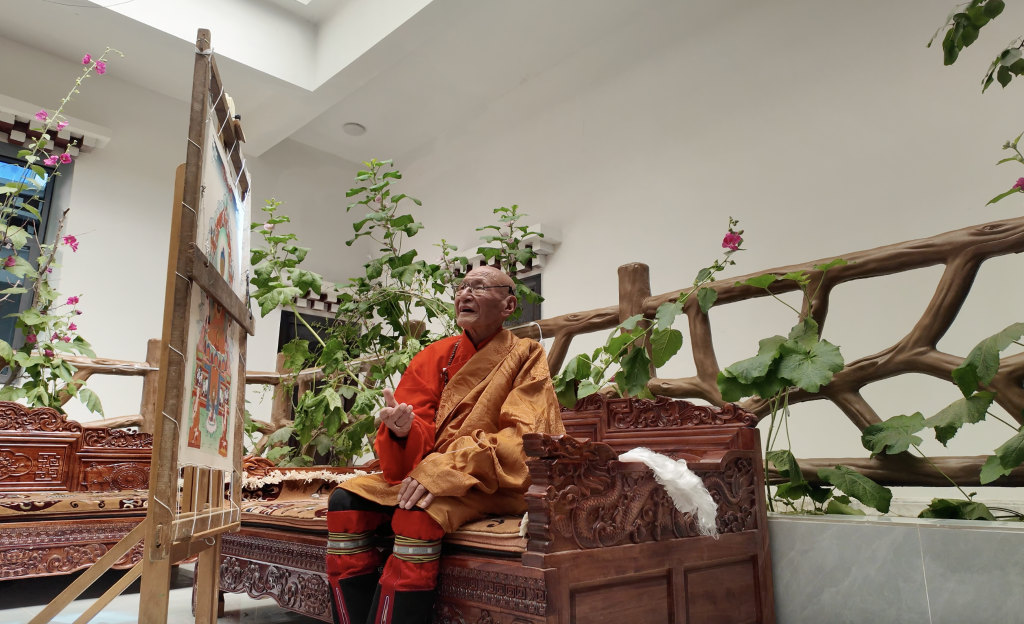 記者9月在西藏昌都市卡若區(qū)嘎瑪鄉(xiāng)見到92歲的嘎瑪?shù)吕諘r,他坐在家中的暖閣里作畫,外孫丁增平措從旁協(xié)助。