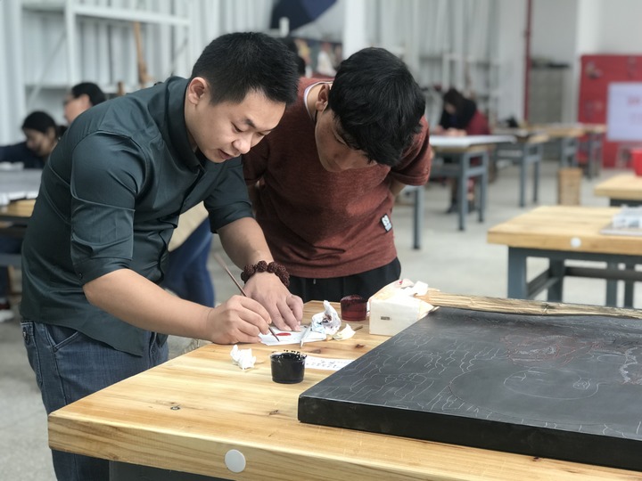 2018年,仁青郎加(右)跟老師學(xué)習(xí)漆畫技法。(受訪者供圖)