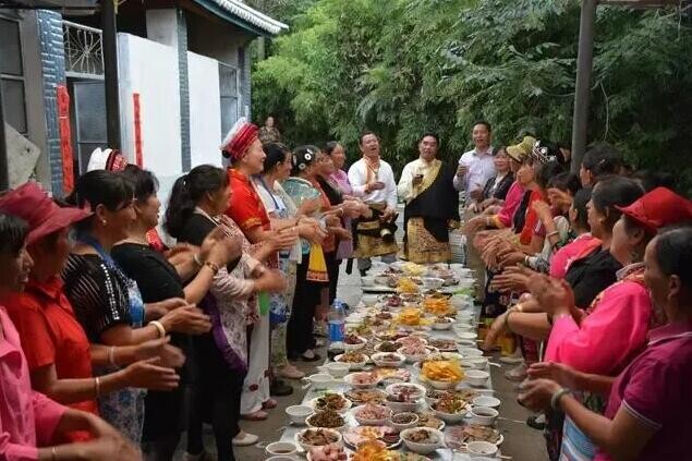云南省大理州洱源縣鄭家莊各族村民齊聚一堂,吃一頓中秋團圓飯。(資料照片)