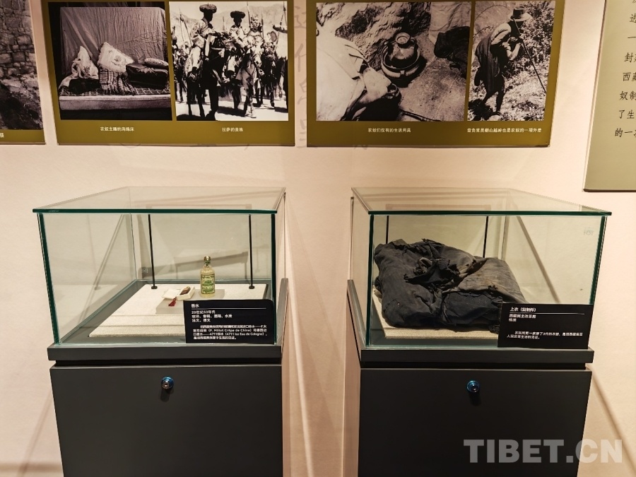 圖為舊西藏貴族使用的香水瓶與西藏民主改革前農(nóng)奴穿著的破舊衣物的對比展覽圖 供圖:民族文化宮