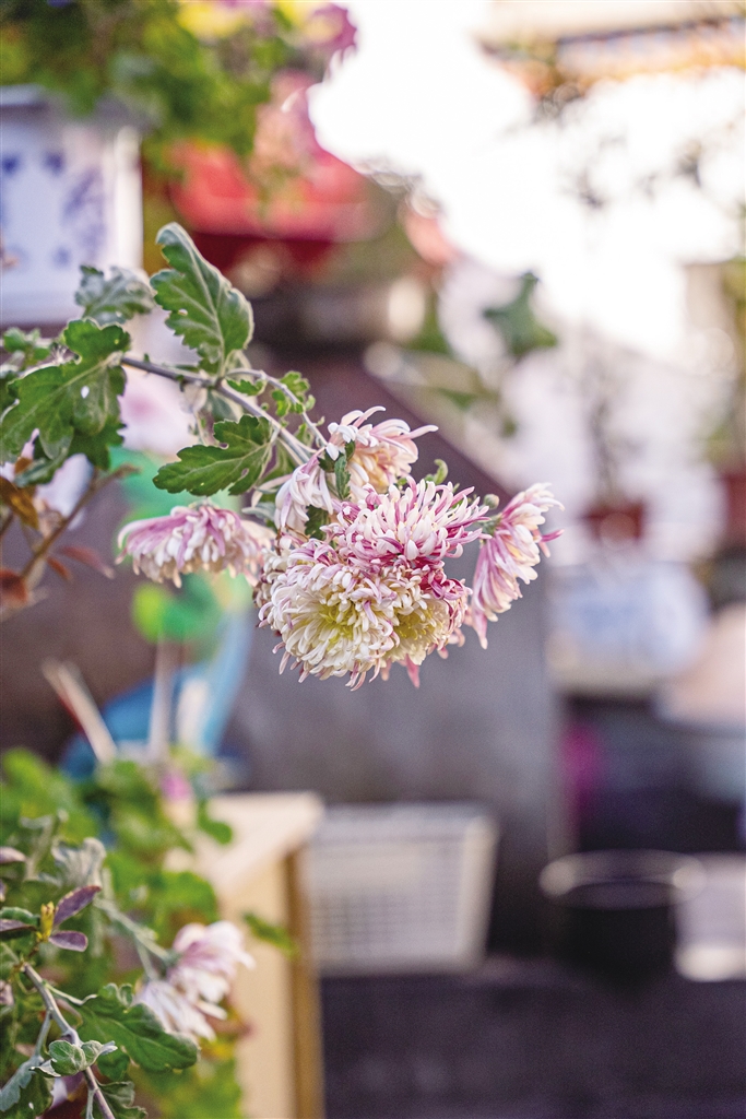 走進(jìn)八廓街、穿過繁華的大昭寺廣場,沿著古巷小路便能來到貢桑孜大院。邁入大院,首先映入眼簾的是獨具韻味的傳統(tǒng)藏式建筑風(fēng)格,白墻、紅頂、黑窗沿,陽光滲過在微風(fēng)中飄動的“香布”,稀稀散散地落在精美的木雕窗花上,襯得陽臺木制立柱上的花紋分外醒目。各式花卉與居民生活用品一同擺放在四四方方的院落中,卻并不顯得擁擠,反而增添了一絲浪漫的煙火氣。