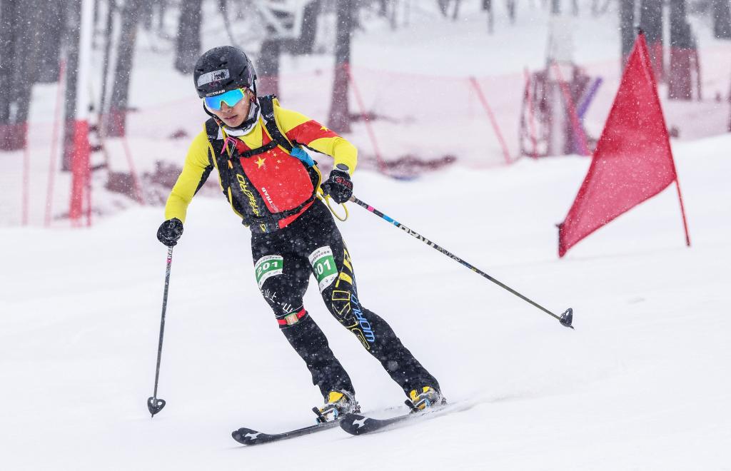 中國(guó)滑雪登山運(yùn)動(dòng)員玉珍拉姆在新疆富蘊(yùn)縣可可托海國(guó)際滑雪度假區(qū)進(jìn)行的全國(guó)首屆滑雪登山冠軍賽短距離(女子組)比賽中。(2023年4月8日攝)。新華社記者 胡虎虎 攝