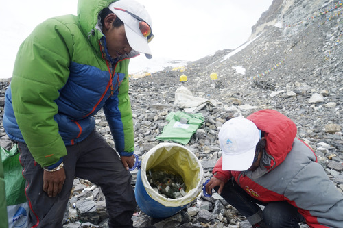 圖為西藏拉薩喜馬拉雅登山向?qū)W(xué)校的向?qū)冊(cè)谥榉暹M(jìn)行垃圾清理(2016年5月21日攝)。 新華社發(fā)(扎西次仁攝)
