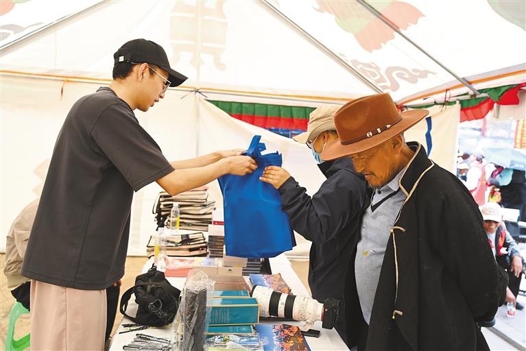 相關(guān)單位工作人員正在向群眾發(fā)放非遺宣傳資料。記者 楊子彥 扎西頓珠