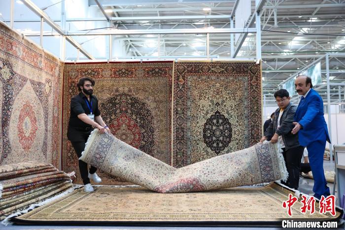 圖為來自巴基斯坦的參展商在擺放地毯。中新社記者 薛蒂 攝