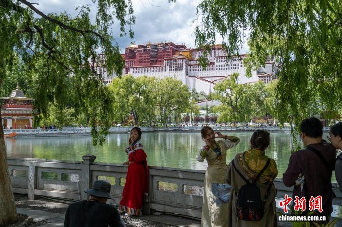 7月29日,游客在布達拉宮廣場東側人工湖附近“打卡”。中新社記者 江飛波 攝