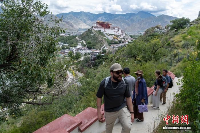 8月4日,外籍游客登上拉薩團結公園藥王山步道。中新社記者 江飛波 攝