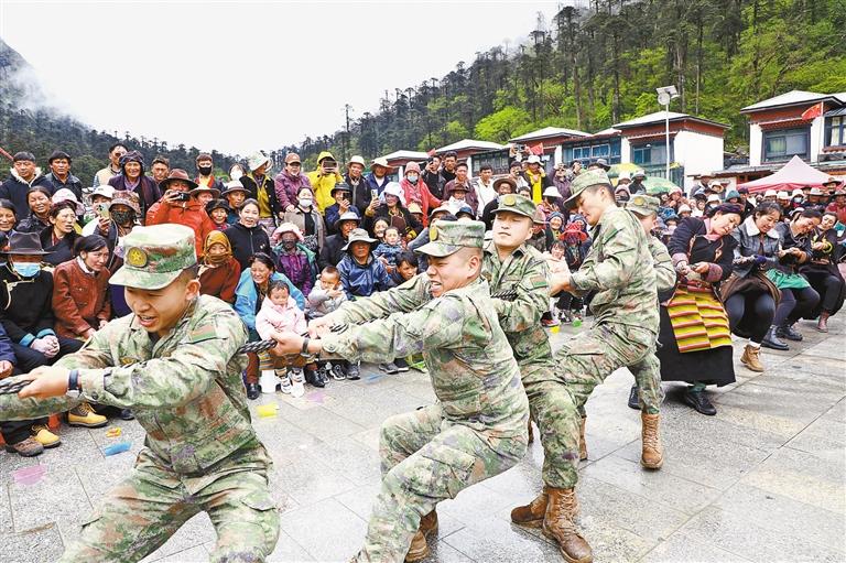 圖為洛扎縣干部群眾和駐地官兵舉行拔河比賽,共同營造軍地團(tuán)結(jié)一心、積極向上的民族團(tuán)結(jié)社會氛圍。