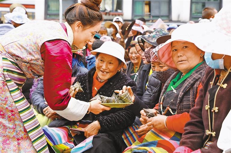 圖為今年端午節(jié)期間,洛扎縣委宣傳部、縣文旅局在德瑪龍村舉辦“培樹文明向上新風(fēng)·崇尚健康幸福生活”系列活動,為新村居民送粽子,以弘揚(yáng)傳統(tǒng)節(jié)日文化凝聚民族團(tuán)結(jié)奮進(jìn)力量。 圖/文 記者 丹增平措