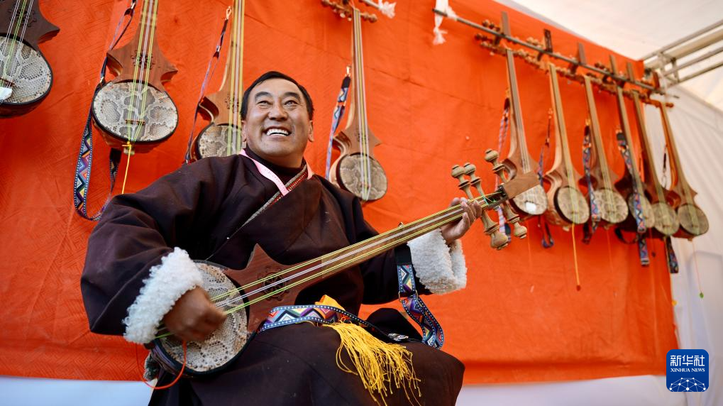 12月2日,洛桑曲扎在雅礱物資交流會(huì)現(xiàn)場彈奏扎念琴。(周昱龍 攝)