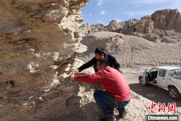 圖為地質(zhì)專家觀察鹽類沉積地層。(資料圖) 柴綜院 供圖
