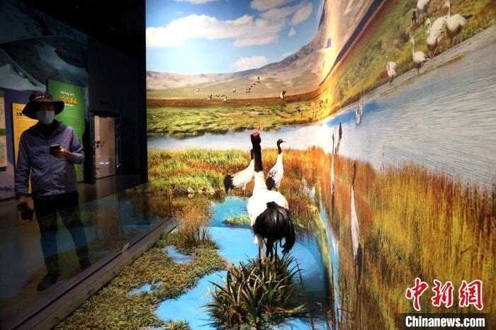 7月24日,參加“中國式現(xiàn)代化的萬千氣象·網(wǎng)絡(luò)名人青海行”活動(dòng)的網(wǎng)絡(luò)名人,抵達(dá)江河源頭青海玉樹藏族自治州,在玉樹州博物館一覽自然與人文之美。玉樹州博物館是玉樹地震災(zāi)后重建十大標(biāo)志性建筑之一,分為序廳、自然展區(qū)、人文展區(qū)、臨時(shí)展廳。其通過實(shí)物標(biāo)本等方式,展示了三江源和可可西里的野生動(dòng)物、草地、森林,以及玉樹州的歷史、建筑、服飾、飲食等。圖為玉樹州博物館展示的黑頸鶴棲息環(huán)境。中新社記者 張?zhí)砀?攝