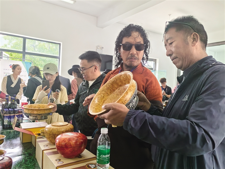 探訪團(tuán)一行前往西藏山南加查達(dá)布傳統(tǒng)文化產(chǎn)業(yè)發(fā)展有限公司探訪加查木碗的制作技藝。在該公司的展廳內(nèi),西藏自治區(qū)級(jí)加查木碗非遺傳承人、公司負(fù)責(zé)人桑珠向探訪團(tuán)詳細(xì)講解了加查木碗從選材、切割、打磨到雕刻的每一個(gè)制作環(huán)節(jié)。桑珠拿起一個(gè)個(gè)造型各異、原材料不同的木碗向探訪團(tuán)介紹著木碗的品質(zhì)分辨技巧、用處等。楊樹(shù)、松樹(shù)、柏樹(shù)……一塊塊承載著歲月的木頭,經(jīng)過(guò)木匠們的一道道復(fù)雜的工序后,變成了精美的藝術(shù)品?!斑@種碗面像圓珠筆點(diǎn)涂的是上等木料制成的精品,最低售賣價(jià)值可達(dá)到4000元一個(gè)?!鄙V檎f(shuō),“現(xiàn)在來(lái)買木碗的人越來(lái)越多,很多游客也會(huì)買回去當(dāng)伴手禮。這讓我更加堅(jiān)定了傳承和發(fā)展這項(xiàng)技藝的決心。”