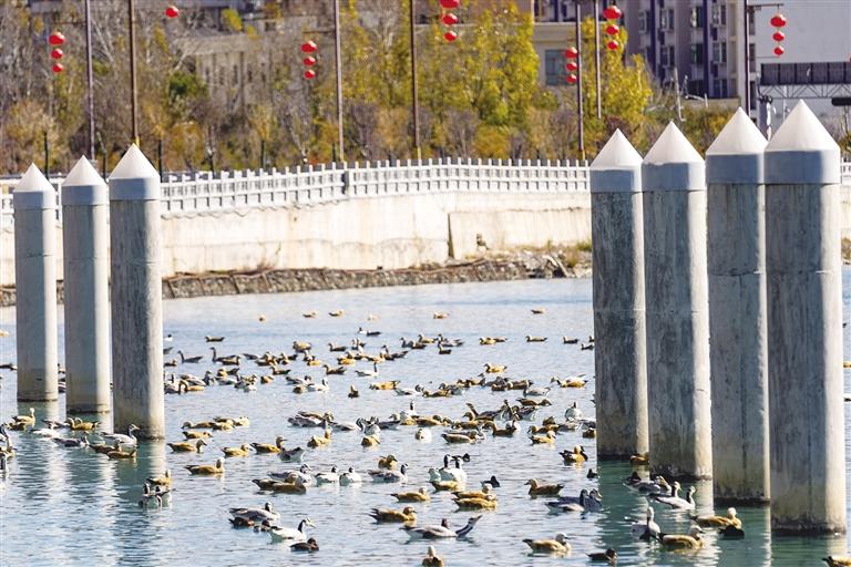 開闊的河面上,斑頭雁、黃鴨、赤麻鴨等鳥類往來于此,此起彼伏的叫聲不絕于耳。在陽(yáng)光的照射下水面波光粼粼,候鳥或嬉游、或覓食、或追逐,這一和諧優(yōu)美的景象,引得不少觀賞的市民和游客舉起手機(jī)或相機(jī)記錄。