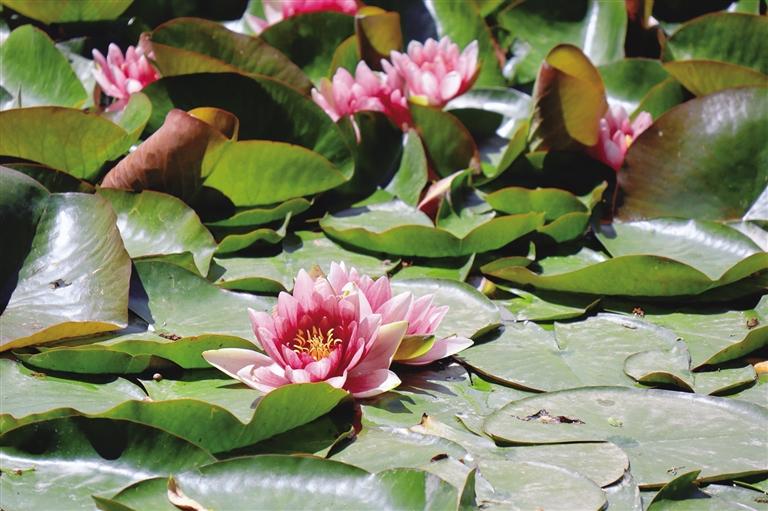 “移舟水濺差差綠,倚欄風(fēng)搖柄柄香?!弊哌M(jìn)柳梧國(guó)際總部城院內(nèi),在停車場(chǎng)的東側(cè),一池蓮花在層層蓮葉的襯托下開(kāi)得正盛。走近池邊,蓮葉特殊的淡淡香味夾雜著潮濕的水汽撲面而來(lái)。粉、白的蓮花在幾場(chǎng)雨過(guò)后,迎著陽(yáng)光依次綻放。幾個(gè)孩子在池邊嬉戲追逐,時(shí)不時(shí)用手挑起水花四濺,遠(yuǎn)遠(yuǎn)看去,頗有“小姑貪戲采蓮遲”的意味。