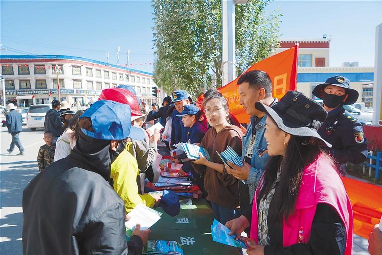圖為那曲市索縣各普法成員單位工作人員為過往群眾發(fā)放生態(tài)環(huán)保相關宣傳資料。通訊員 益西卓嘎 攝