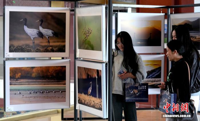 圖為觀眾欣賞黑頸鶴主題攝影展中的作品。李林 攝