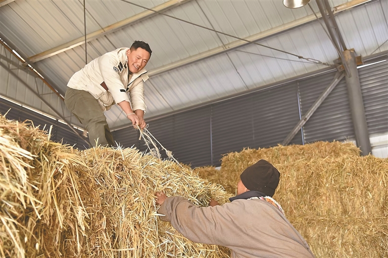 圖為熱達(dá)與同事整理冬儲飼草。青海日報記者 余暉 攝