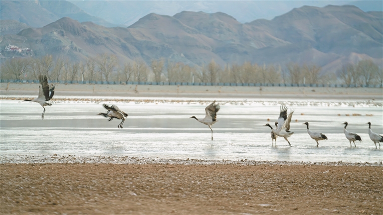 1月17日,天還未亮,拉薩市林周縣卡孜水庫(kù)的上空便回蕩著黑頸鶴的鳴唱。