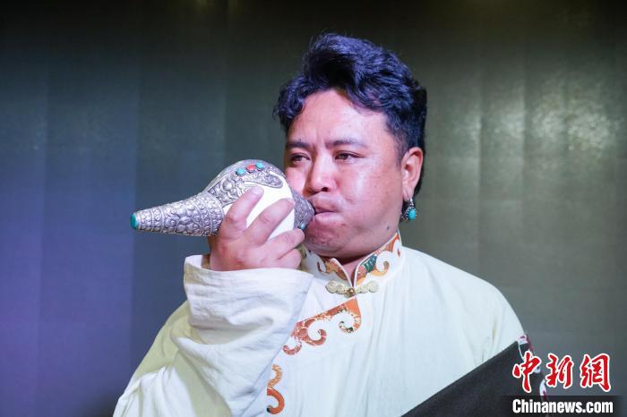 多才多藝的土旦金巴是果洛州歌舞團的主持人,也在樂團中負責吉祥海螺?!斑@是小時候舅舅教我吹的,煨桑時我們會用它祈禱、許愿?!彼榻B,“在其他地方演出時,聽到海螺聲響起,觀眾會一直鼓掌,給我很大感動,也希望將這份來自源頭的祝福傳遞給他們。”