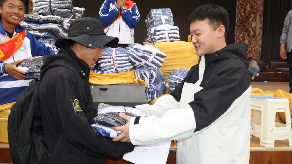 9月6日,中央民族大學第26屆研究生支教團成員侯宇航(右)為拉薩那曲第二高級中學報到新生發(fā)放生活用品。(嘎瑪曲宗 攝)