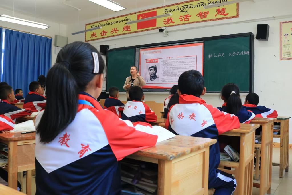 9月3日,林芝市米林市小學副校長曾潔為學生上課。新華社記者沈曉朦 攝