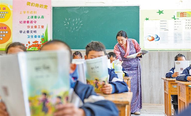 在娘蒲鄉(xiāng)中心小學(xué),娘蒲鄉(xiāng)中心小學(xué)藏文老師格桑曲珍在上藏文課。格桑曲珍曾經(jīng)也是該校學(xué)生。