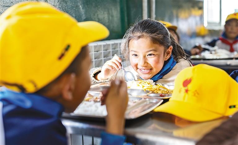 娘蒲鄉(xiāng)中心小學(xué)的學(xué)生在食堂用餐。新華社記者 丁增尼達(dá) 攝