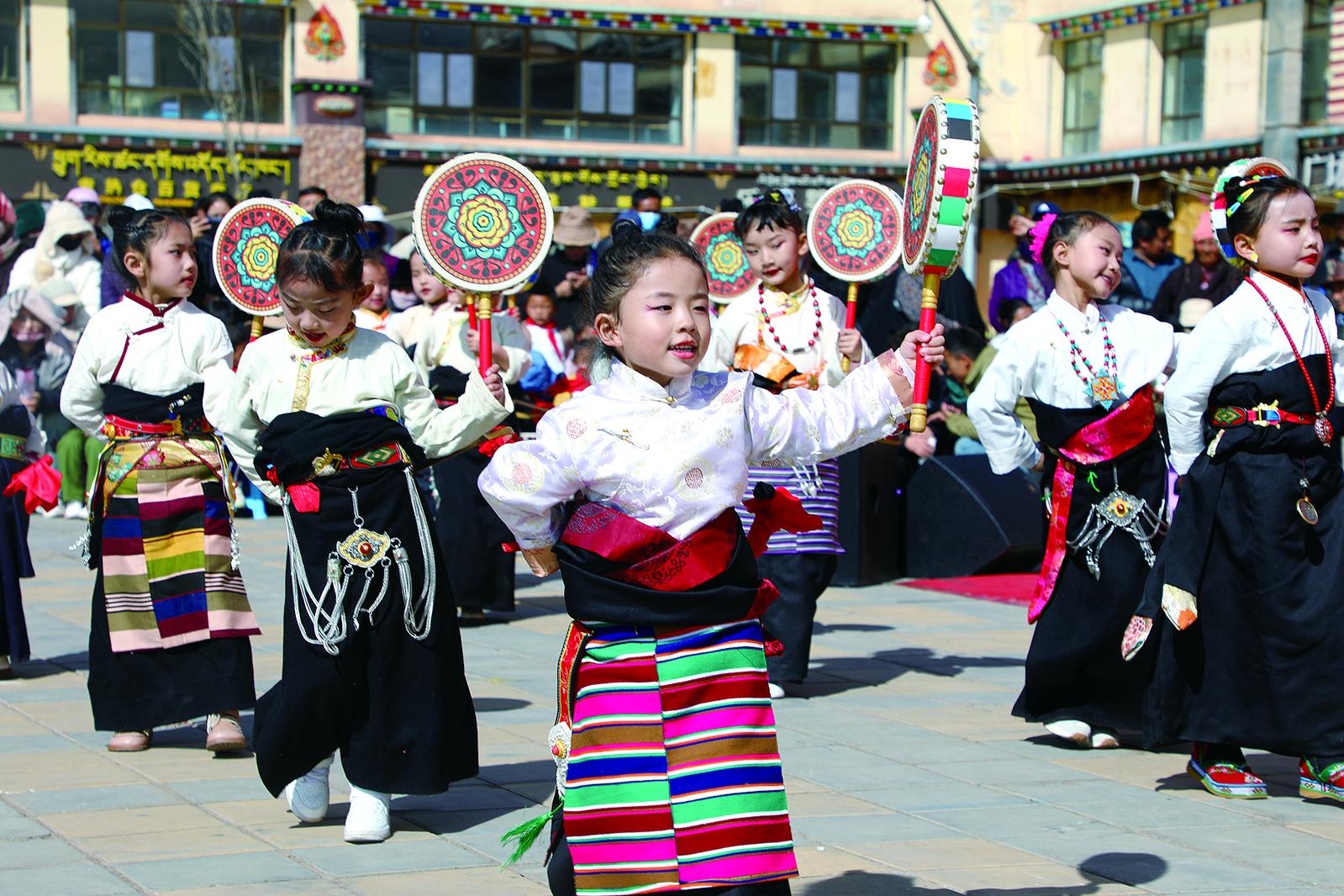 孩子們跳起藏族傳統(tǒng)舞蹈。囊謙縣中心光明幼兒園供圖