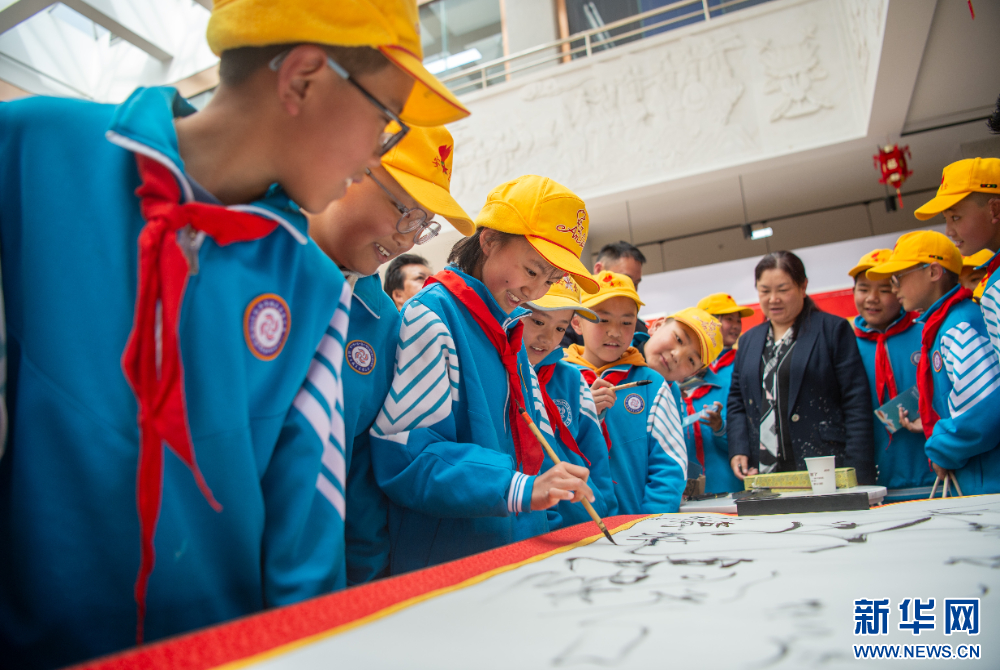 4月9日,拉薩市城關(guān)區(qū)雪小學(xué)學(xué)生在西藏自治區(qū)圖書館讀書活動現(xiàn)場體驗(yàn)書法。新華網(wǎng) 旦增努布 攝