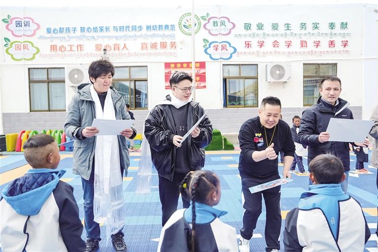 5月8日,熊喵來(lái)了創(chuàng)始人吳紅濤吹響口哨,喊道:“準(zhǔn)備上體育課啦!”然后帶領(lǐng)孩子們練習(xí)顛球。操場(chǎng)上,孩子們手中嶄新的籃球歡快跳躍,在小手掌間滾來(lái)滾去,惹得他們咯咯直笑。笑聲與籃球撞擊地面的“砰砰”聲交織,回蕩在海拔4565米的朗果村幼兒園上空——這里是剛剛落成的全國(guó)第3254座鄉(xiāng)村兒童操場(chǎng),也是第53座“太陽(yáng)花”操場(chǎng)。
