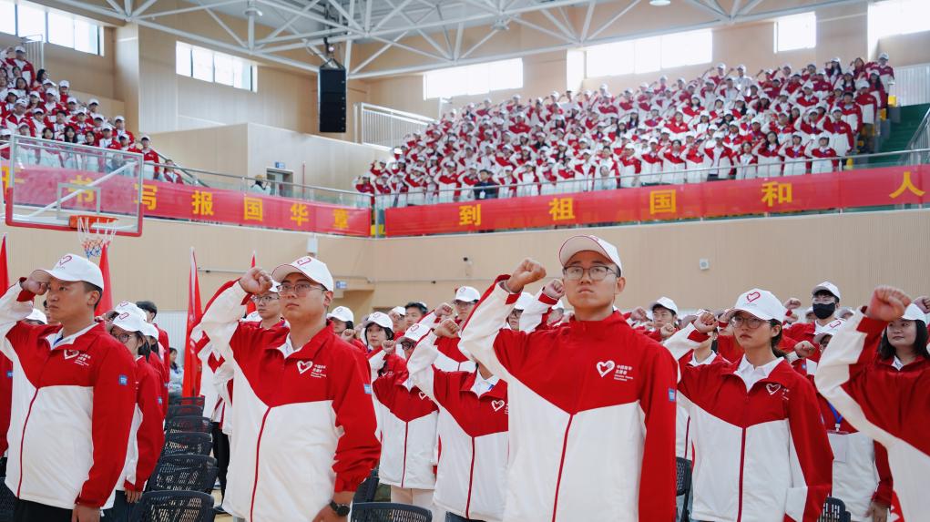 7月29日,2025年大學(xué)生志愿服務(wù)西部計劃服務(wù)西藏專項志愿者出征儀式上,志愿者們正在宣誓。 陳梟 攝