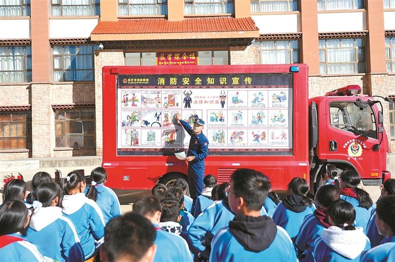 消防宣傳員依托流動(dòng)消防宣傳車為學(xué)生講解消防安全知識(shí)。肖暄 攝