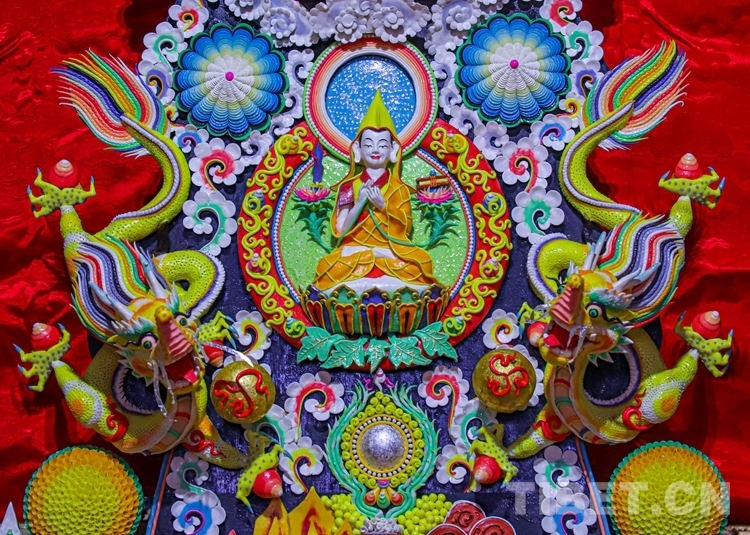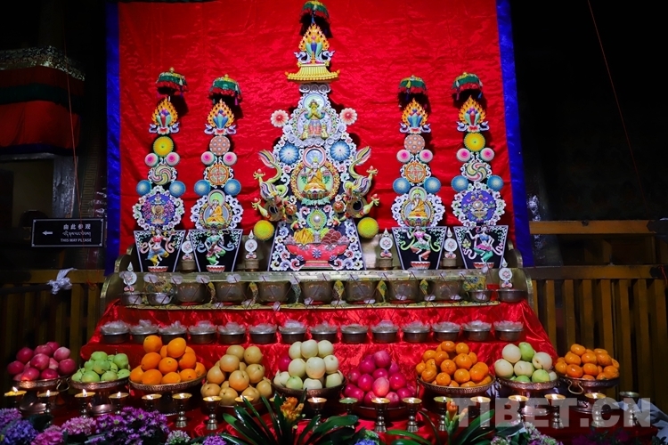 據(jù)了解,每年藏歷正月十五日是藏傳佛教宗教節(jié)日“覺阿卻巴”,即“正月十五供奉節(jié)”。每年這天大昭寺都會展出精美絕倫的酥油花雕塑,但是雕塑的內(nèi)容每年都有所不同,其內(nèi)容會有佛祖釋迦牟尼、師徒三尊、吉祥八寶、和睦四瑞等酥油雕塑。