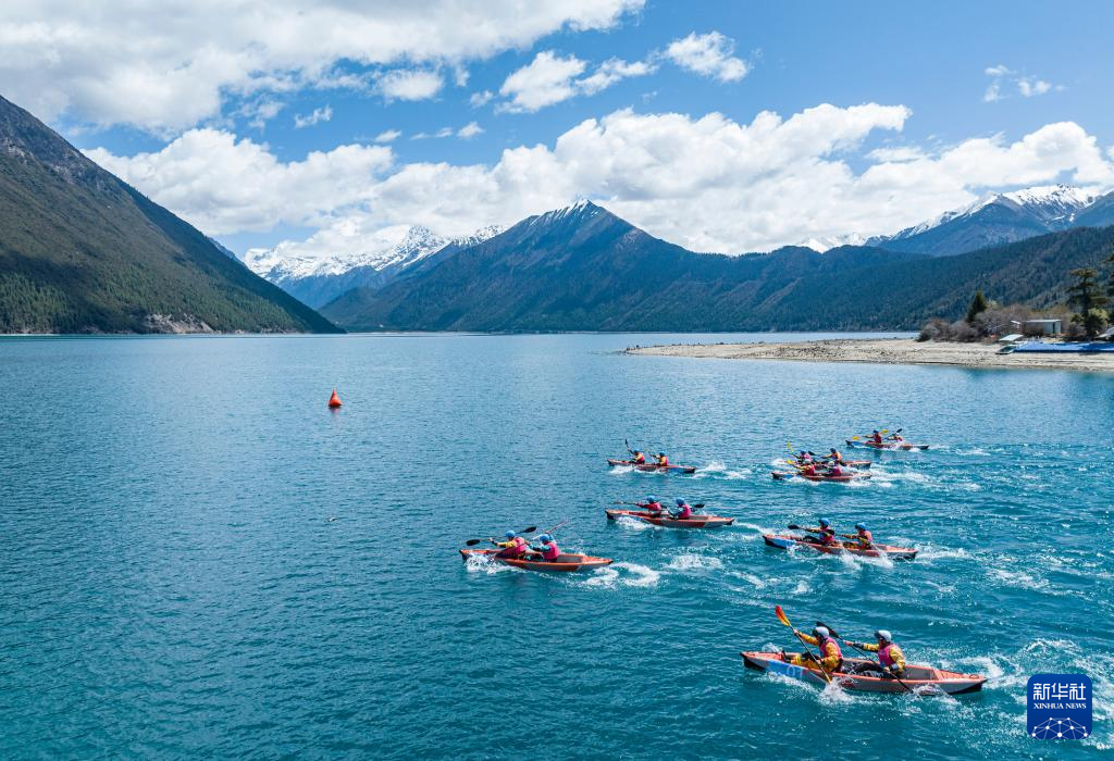 當(dāng)日,2024年巴松措國際漂流公開賽在西藏林芝市工布江達(dá)縣開賽。30余支隊(duì)伍在巴松措的湖面上展開角逐,完成兩人漂流艇競速賽和四人漂流艇排位賽的比拼。