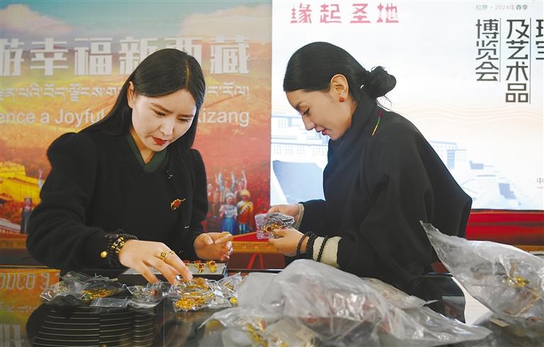 4月24日,2024年春季中國(guó)西藏珠寶及藝術(shù)品博覽會(huì)在自治區(qū)會(huì)展中心開幕。博覽會(huì)現(xiàn)場(chǎng)熱鬧非凡,許多市民游客前來(lái)參觀、選購(gòu)商品,共同感受西藏文化的獨(dú)特魅力。 圖為參展商在整理展位上的商品。 記者 王敏 攝
